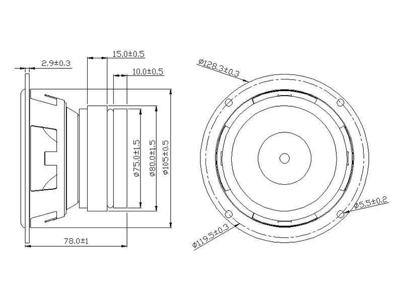 | Voice Coil Imp. | 4 ± 0.6 Ω ( 500 Hz 1 V ) |