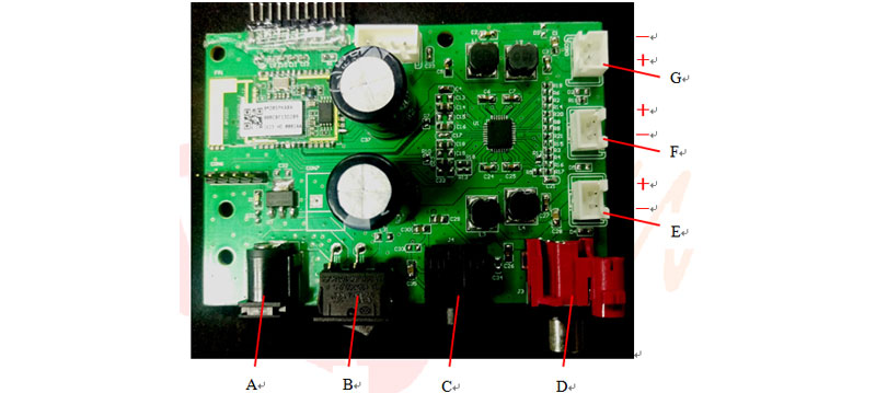 E. Right channel output (2.54mm 2pin Wafer): Connect the 4 Ω speaker unit, connect the speaker with the D